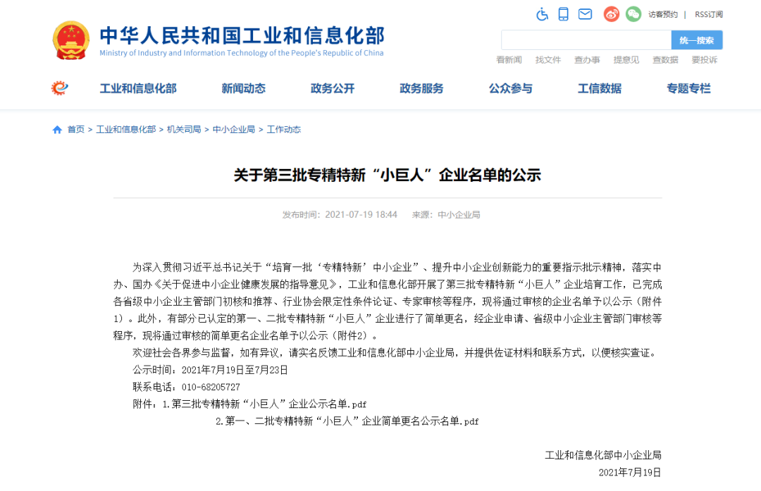 2021年7月19日,中华人民共和国工业和信息化部公示了第三批专精特新“小巨人”企业名单。上海仅有182家企业被列入专精特新“小巨人”企业培育名单,我们EVO真人(上海)有限公司在名单之列(序号615)。