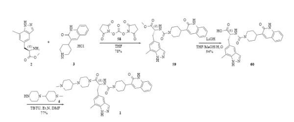 路线二[18]:化合物61(或62)和4经缩合、脱保护、偶联反应制备得到扎维吉泮(图15)。